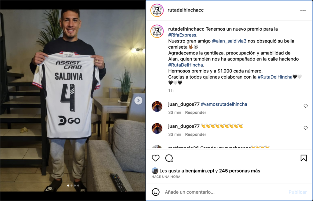 Junto con agradecer esta acción, la agrupación reveló que el zaguero central constantemente está a disposición de ayudar y que incluso ha participado activamente de esta iniciativa. «Tenemos un nuevo premio para la Rifa Express. Nuestro gran amigo Alan Saldivia nos obsequió su bella camiseta. Agradecemos la gentileza, preocupación y amabilidad de Alan, quien también nos ha acompañado en la calle haciendo Ruta Del Hincha«, se señaló en el posteo.